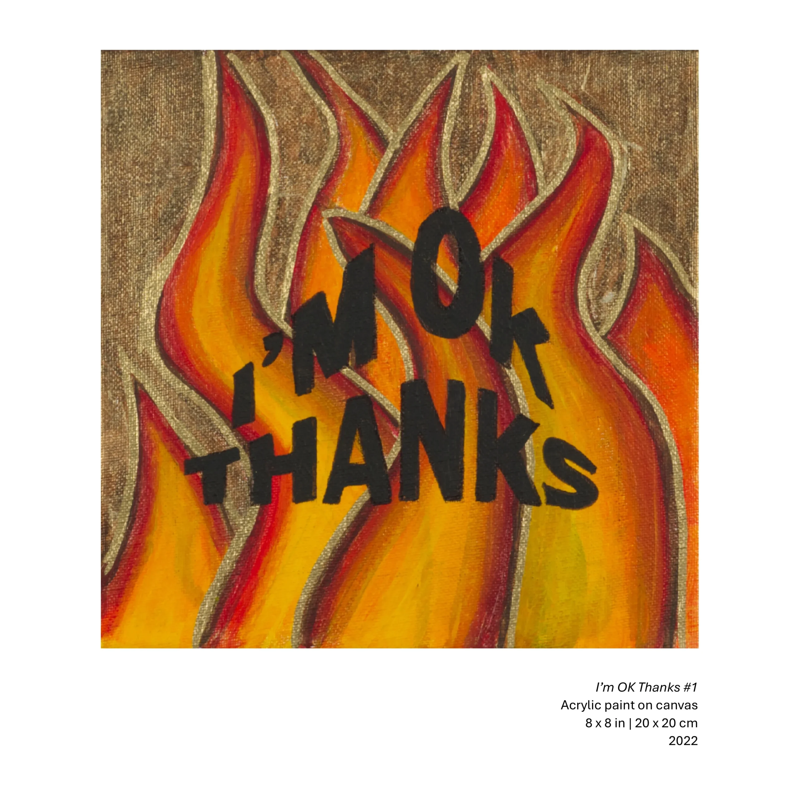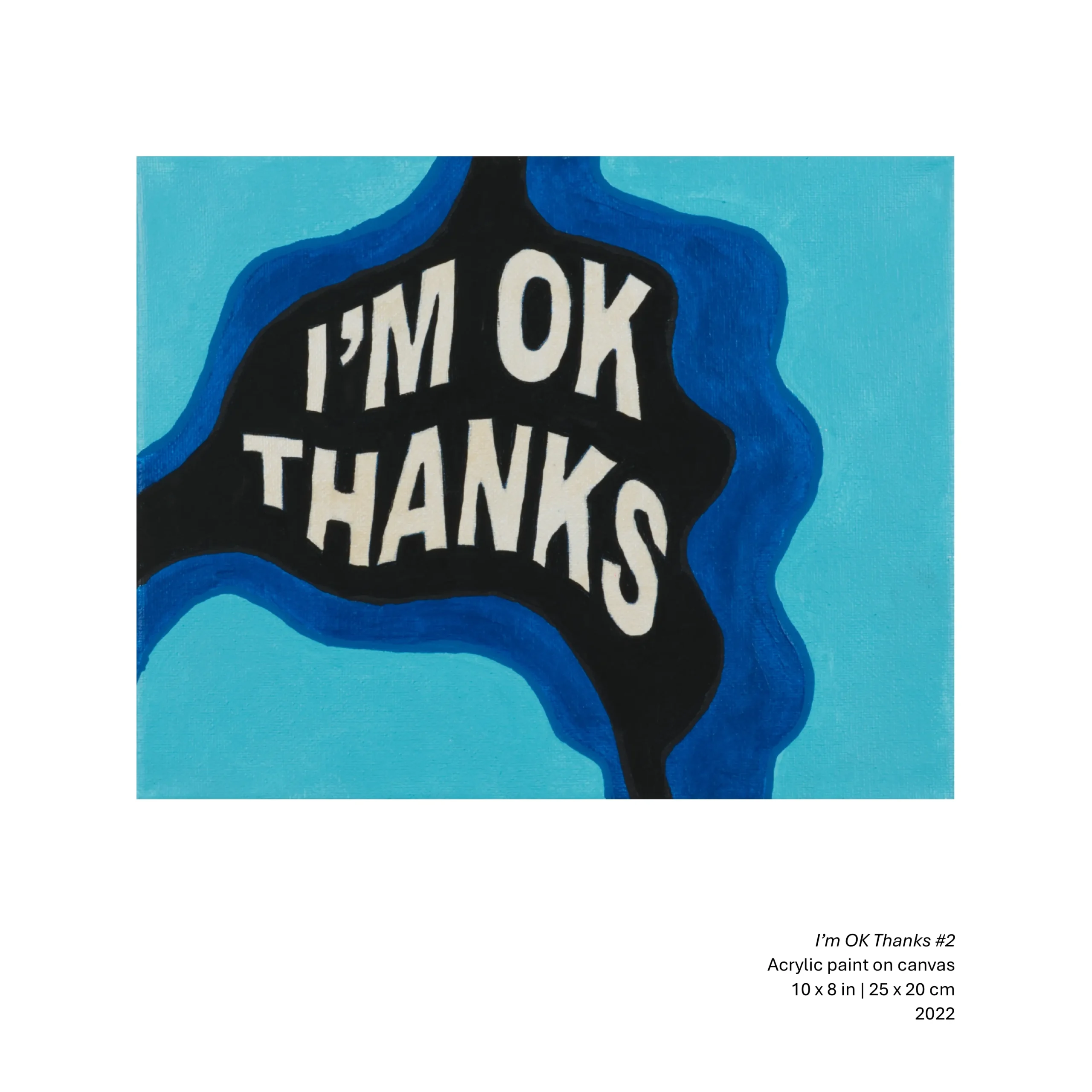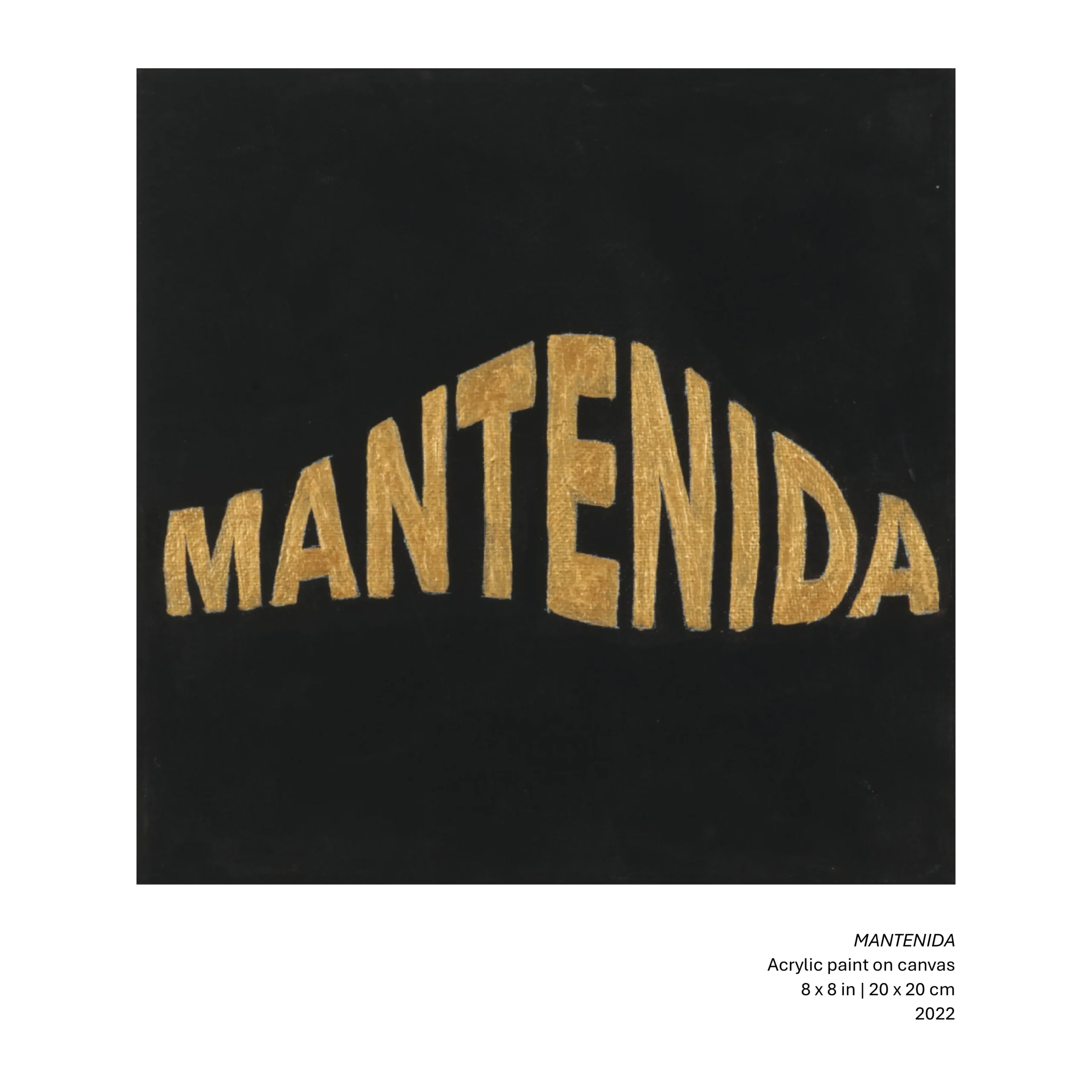 This series of paintings, created during a period of introspection and grief, serves as a medium for Yuskadd to express profound emotions and complex experiences in a concise, direct way. Words take center stage in her work, with phrases like “I’m OK, Thanks” and “Mantenida” that reveal the irony and contradiction between the apparent simplicity of the message and the underlying emotions of anguish, sadness, and emptiness. Through language, Yuskadd confronts themes of economic dependence, depression and perceived vulnerability, ultimately resignifying and reconciling her relationship with these concepts. Inspired by the immediacy and punch of a text message, this series uses words as a vehicle for intimate, precise communication, transforming each piece into a testament of resilience and self-acceptance.