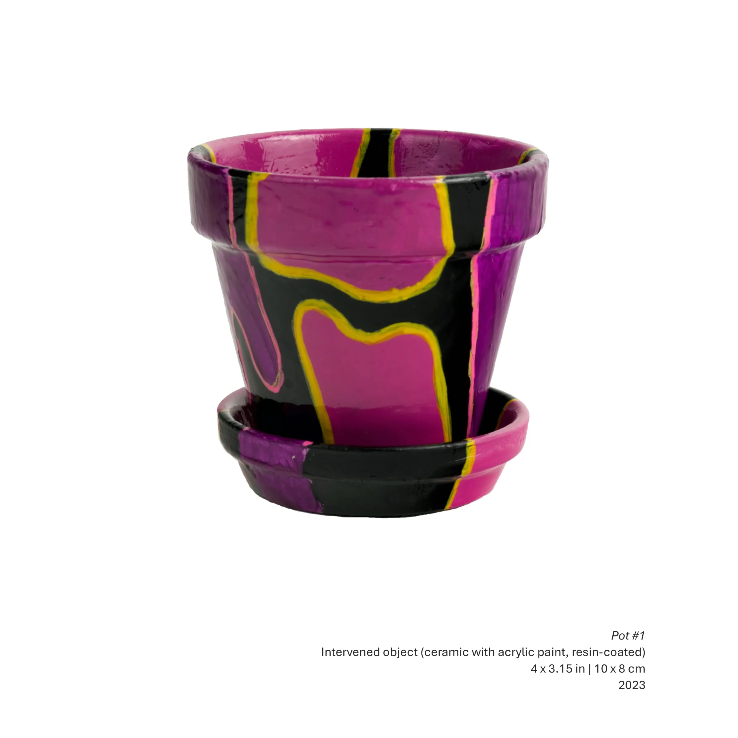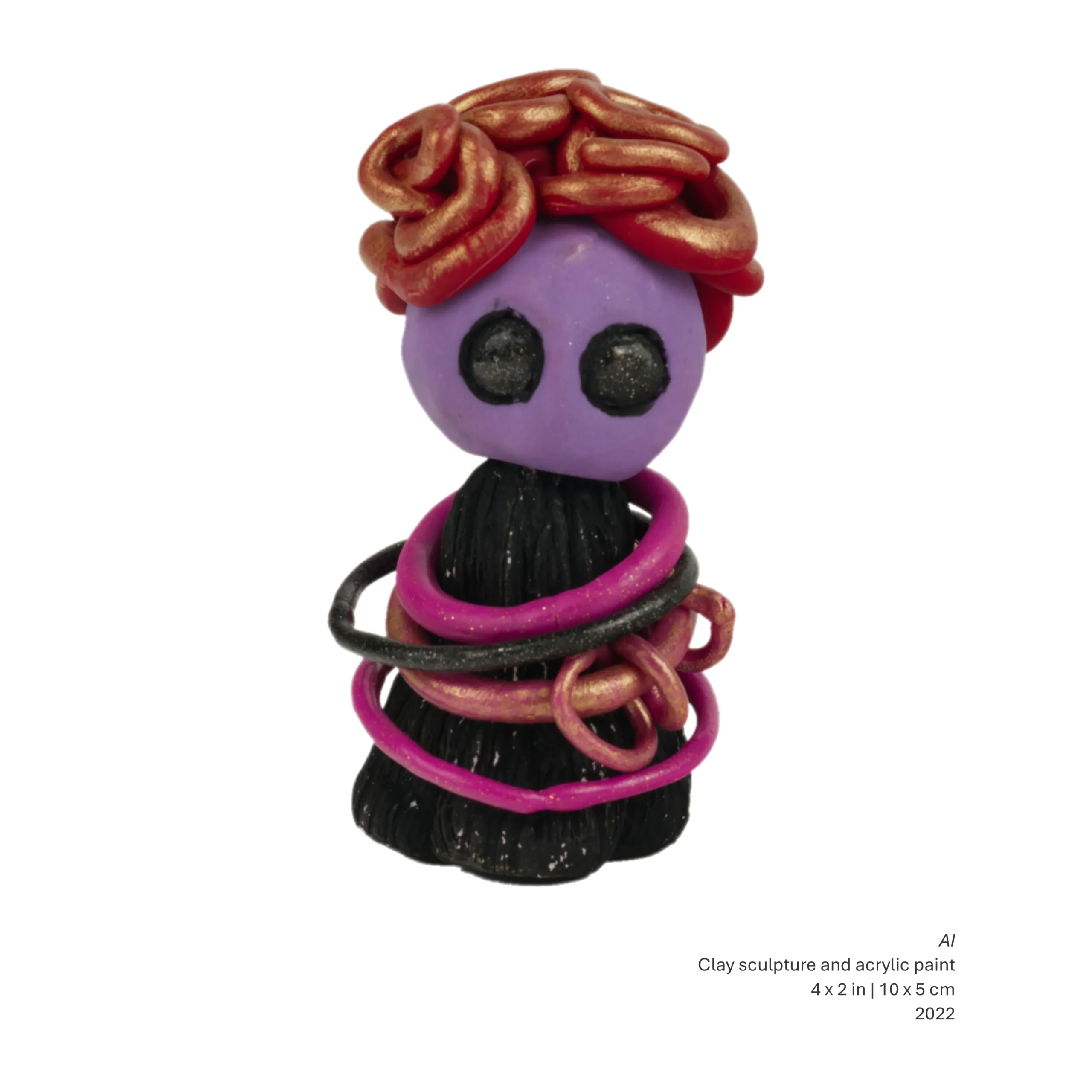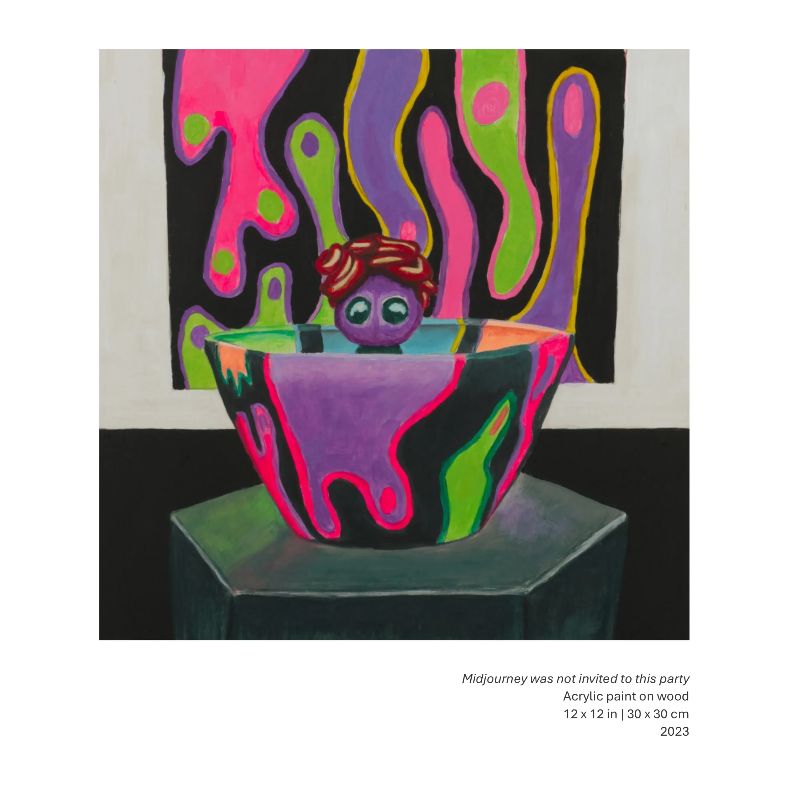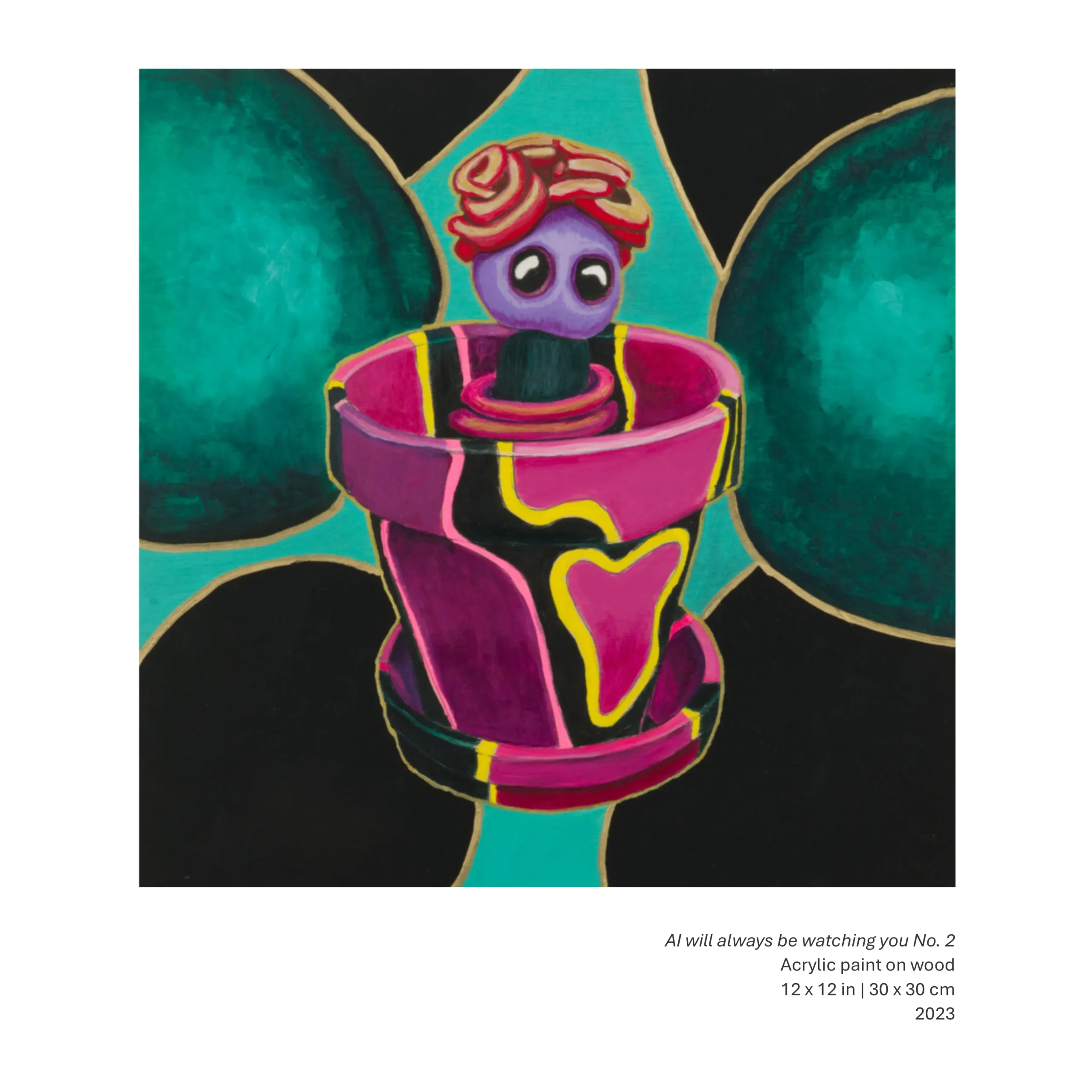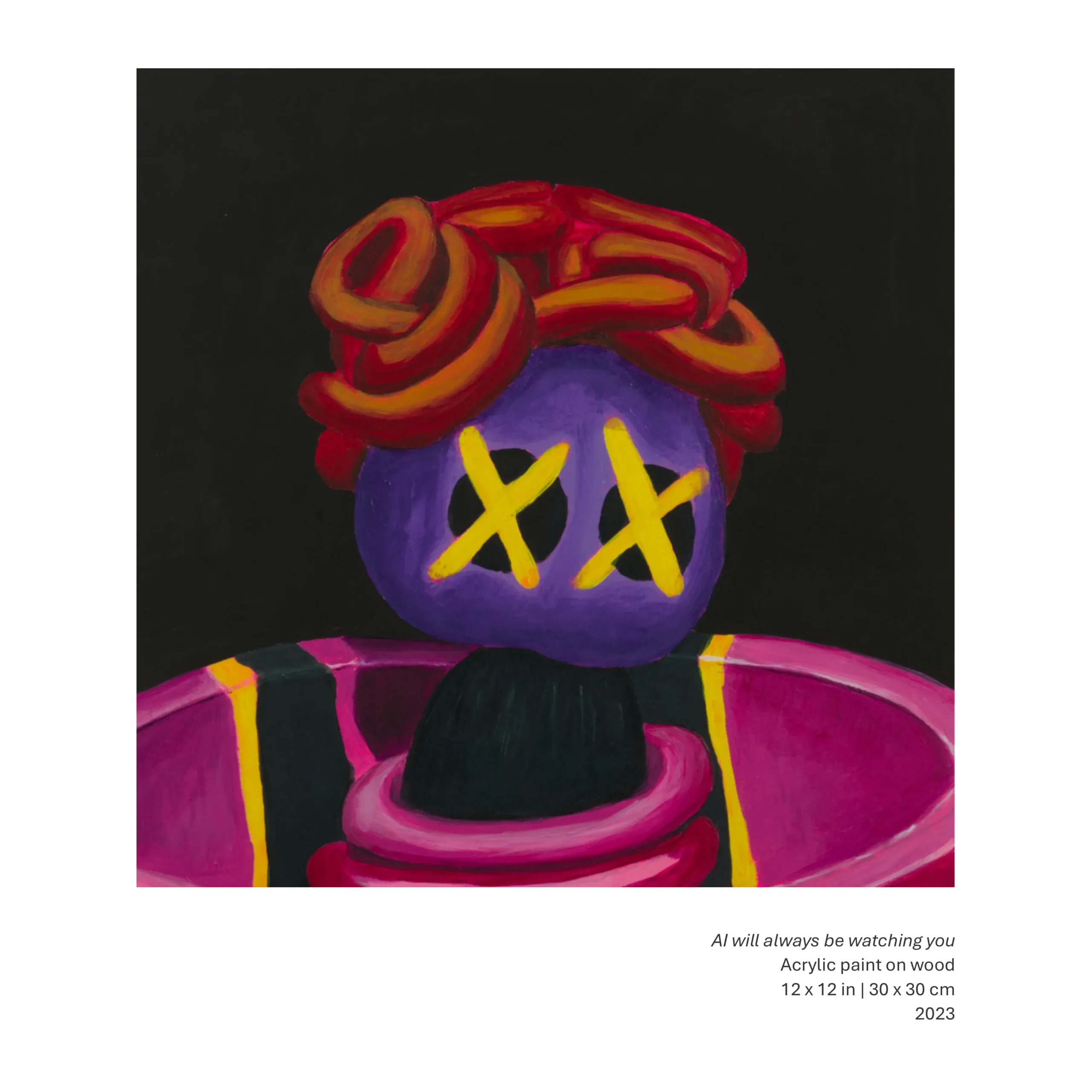 In When Life Imitates AI, Yuskadd invites us to reflect on a fascinating and uncertain future: What will happen when life begins to emulate artificial intelligence? Through the recreation of her own pieces in paintings and objects, Yuskadd draws a parallel with algorithms that generate images based on pre existing visual data.